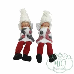 Kislány angyal szárnnyal; kötött sapiban; fehér/piros havas; lógólábú; 9,5cm