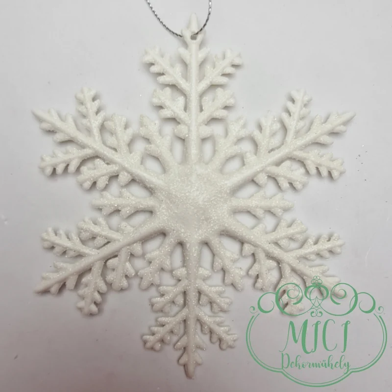 Akasztós karácsonyfa dísz; hópihe; fehér glitteres; műanyag; 14*14cm