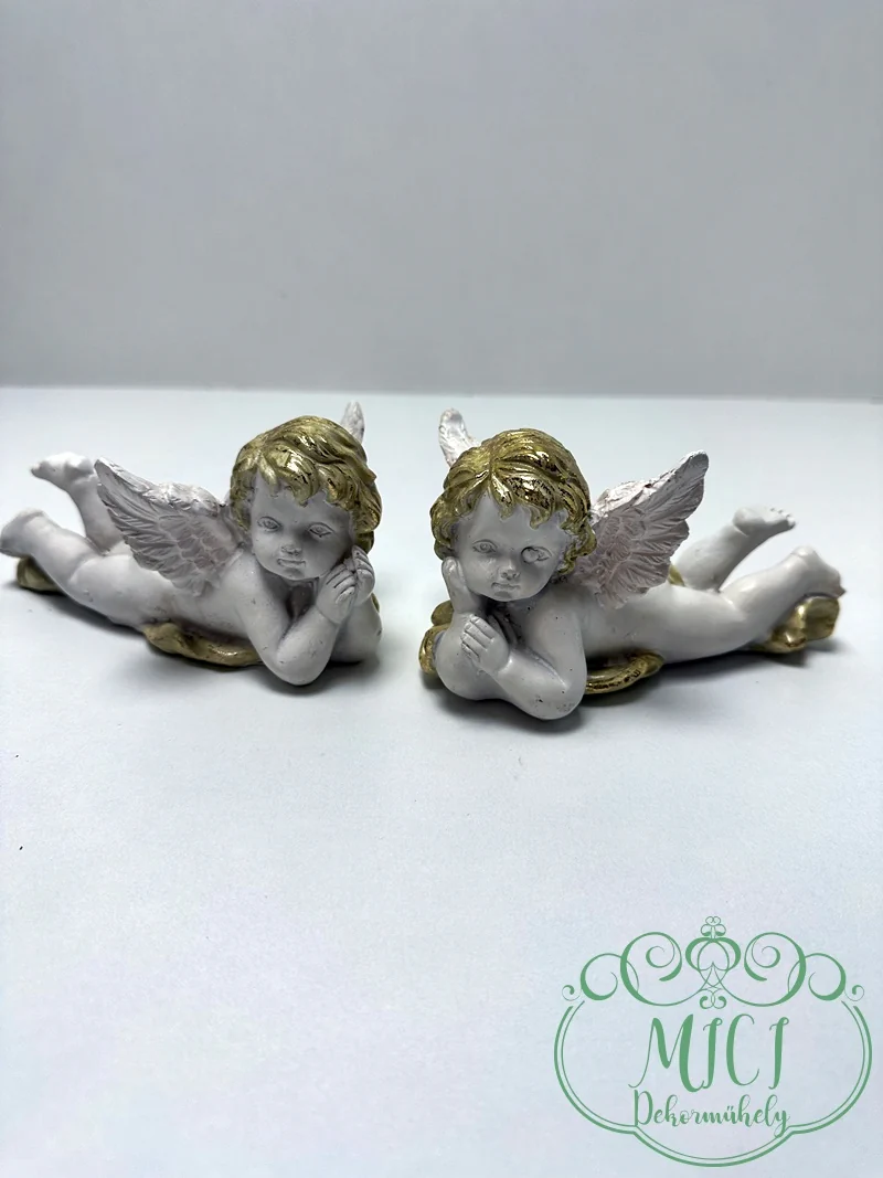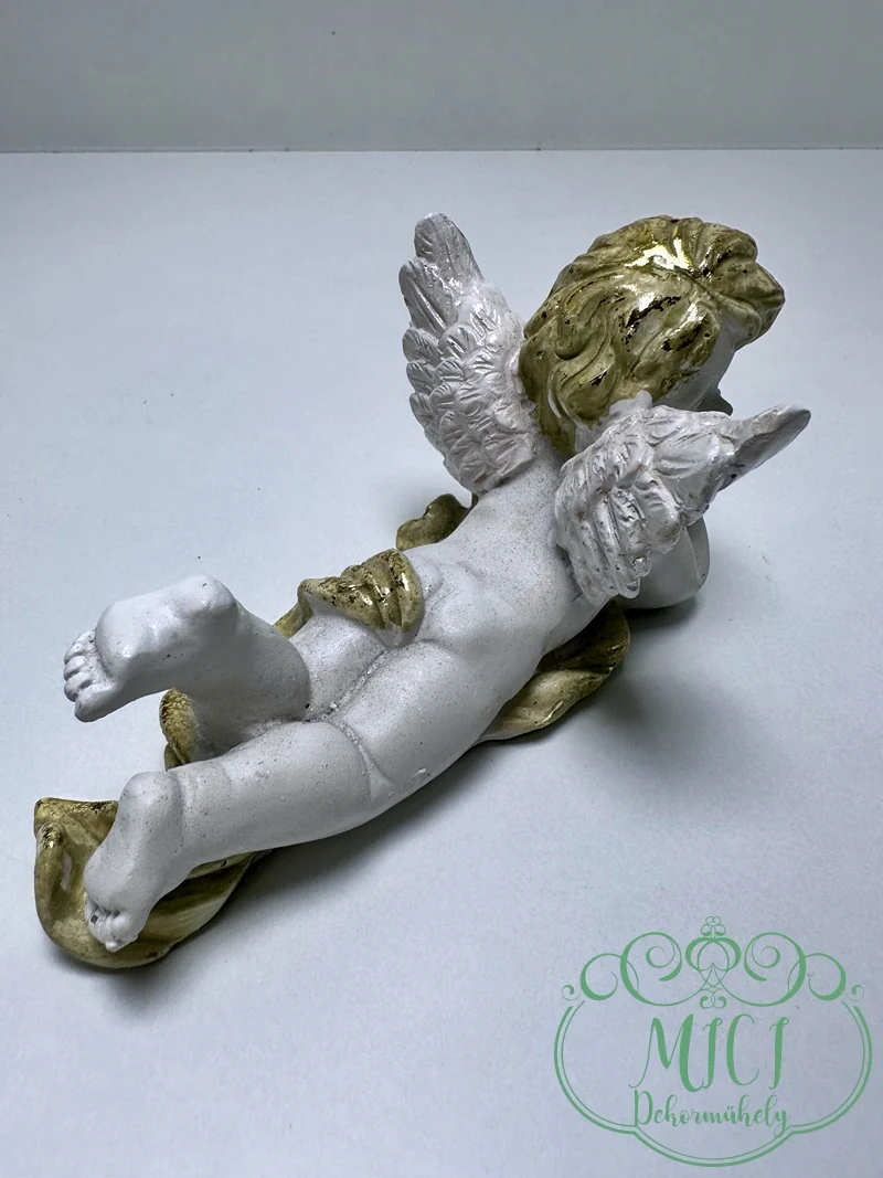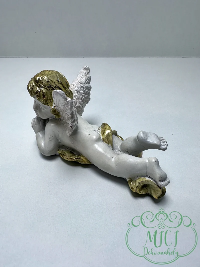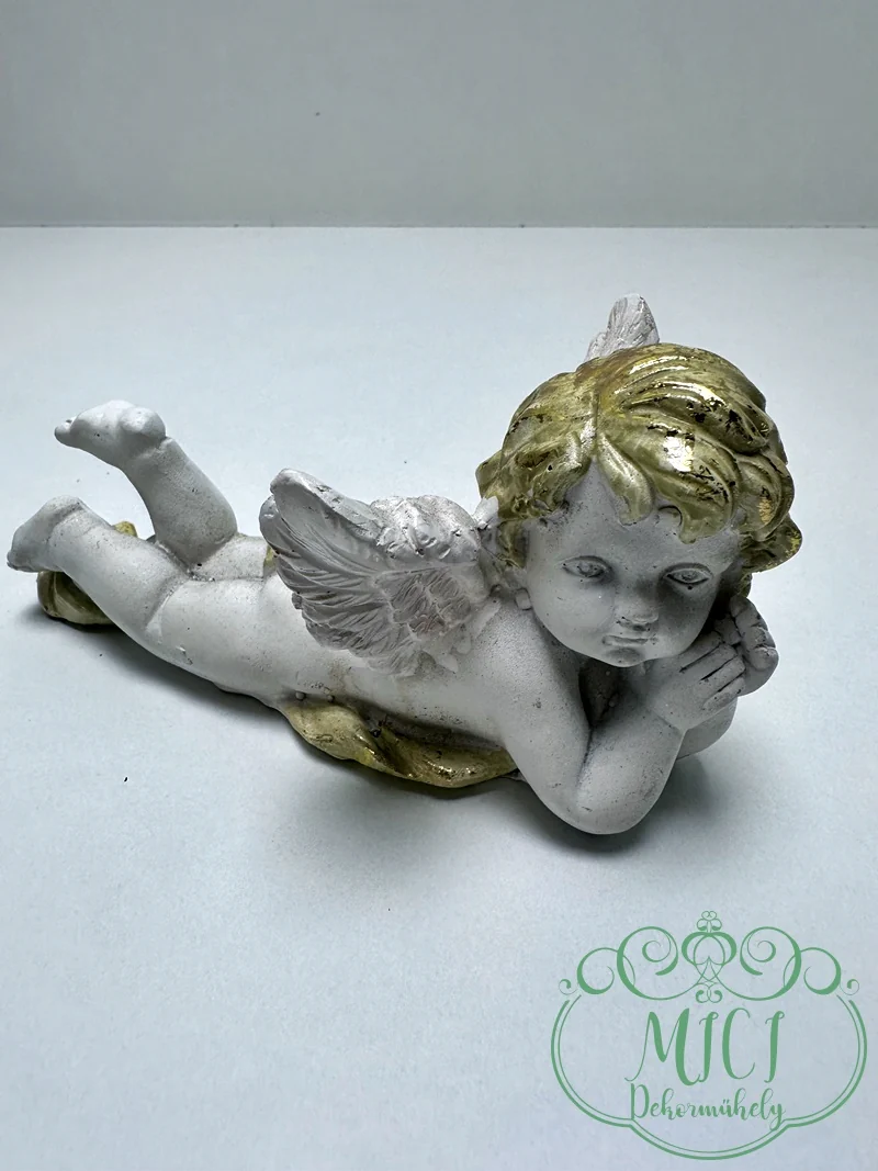 Angyal; hason fekvő angyal; fehér-arany; jobbra/balra néz; polyresin; 15,5*7,5cm