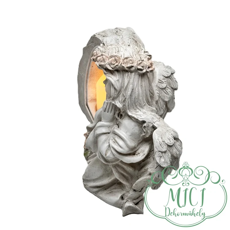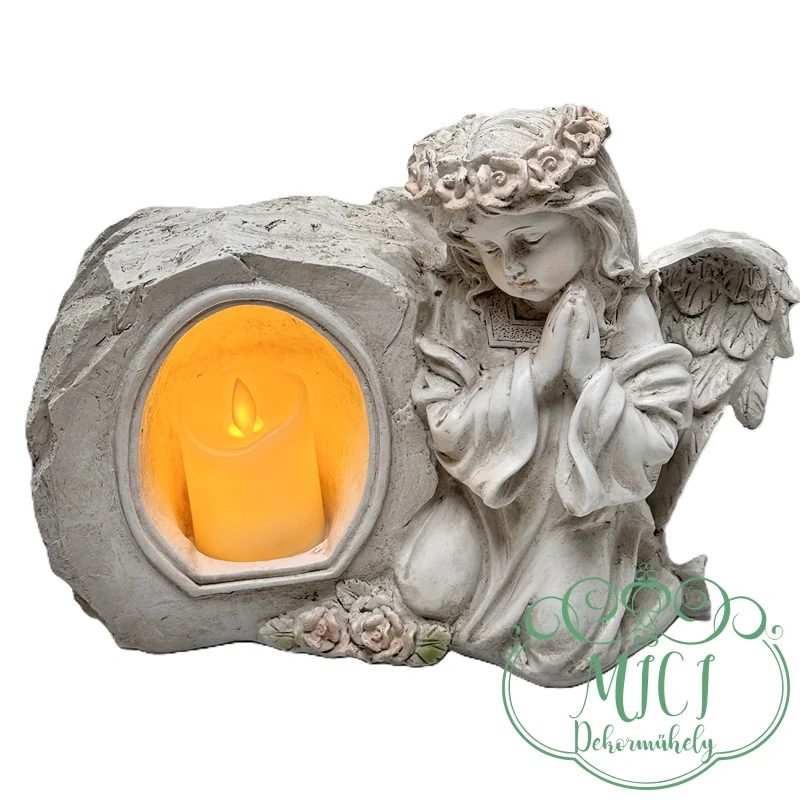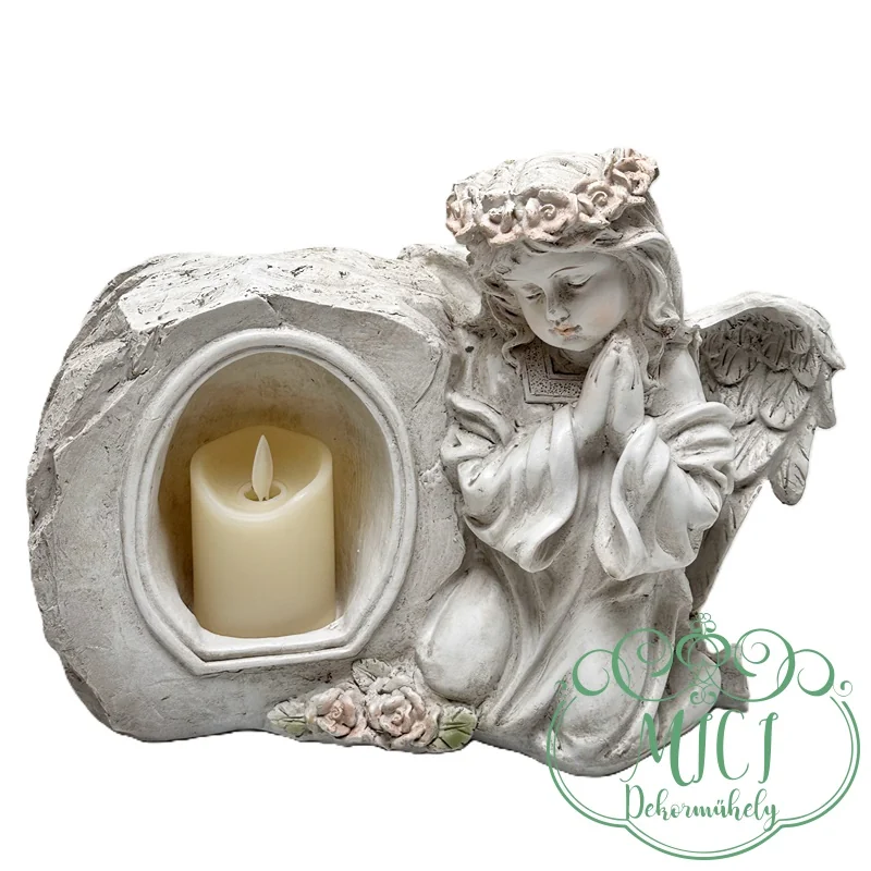 Angyalka; megemlékezés LED-es gyertya; imátkozó angyal; fehér-szürkés; polyresin; 27*19cm