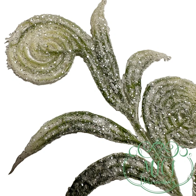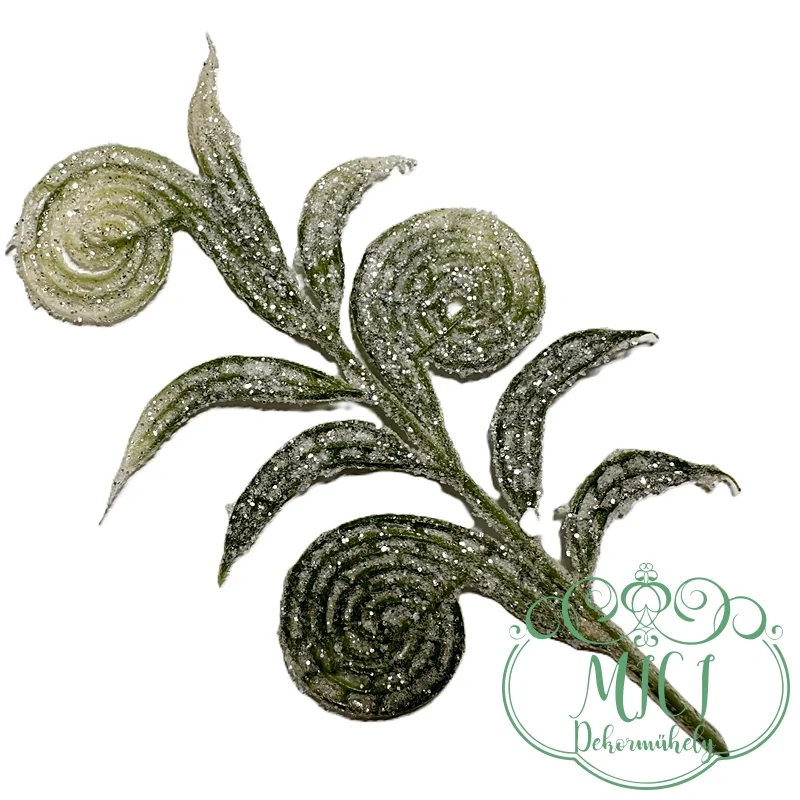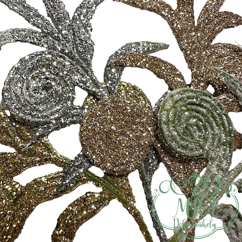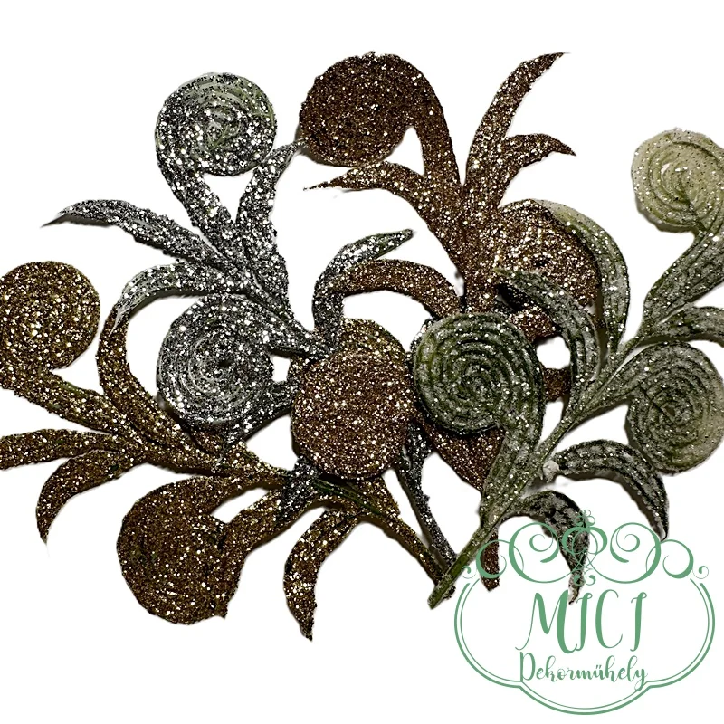 Csillámos dekor; pick ág; spirál alakú levél; arany/ezüst/bronz/havas-zöld; ~10*7cm; 1db/csomag