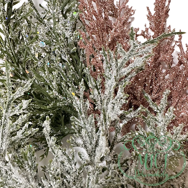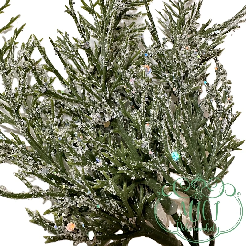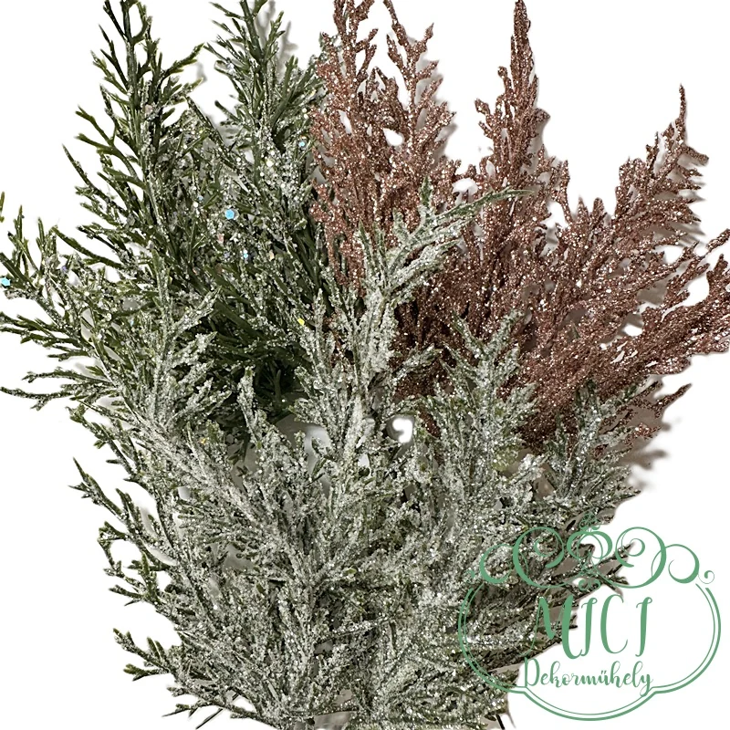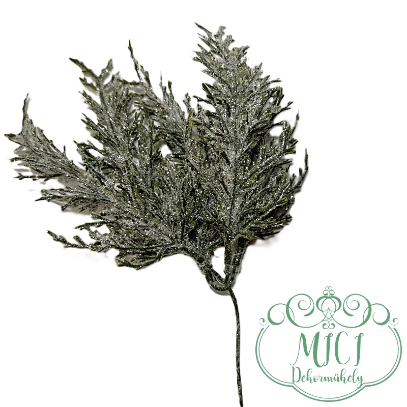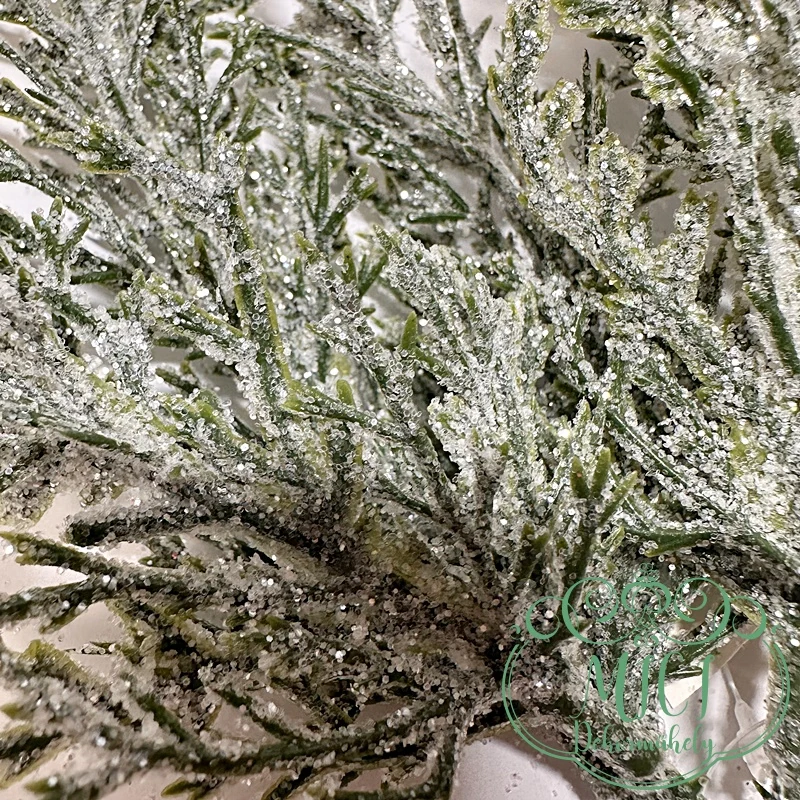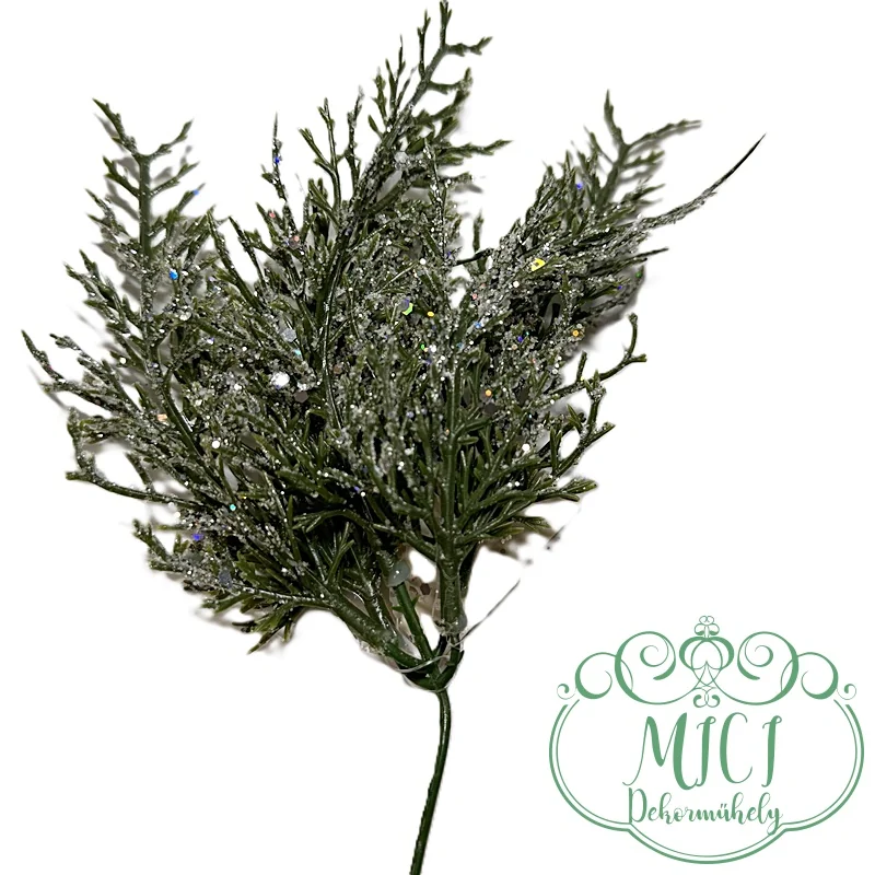 Csillogó pick ág; tuja szerű; zöld glitter/havas/mályva; 5ágacska/csokor; ~15cm+betűző