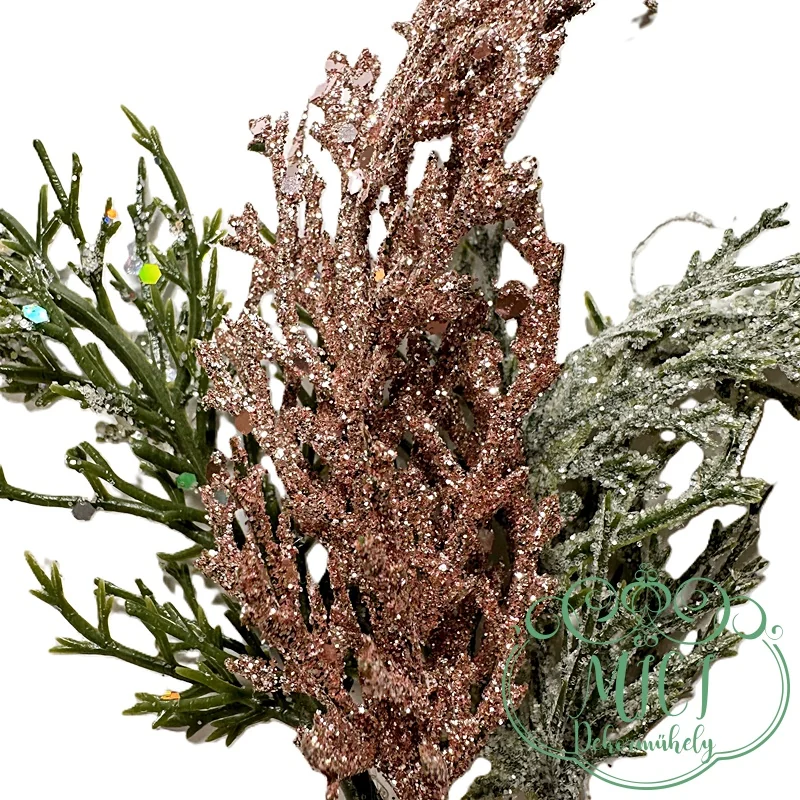 Pick ág; dekorációs ág/ágacska; Csillogó dekorációs alapanyag; Glitteres ágacska; betűzós szárral; virág-leveles csokros jellegű home decor; glitteres/flitteres csillámos ágacskák. Kiegészítője lehet: karácsonyi, adventi asztaldísz; ajtókopogtató; egyéb lakásdekoráció; karácsonyfadísz, csokor. Kreatív ajándék alapanyag, kiegészítője lehet: születésnap, névnap, esküvő, anyák napja, egyéb esemény