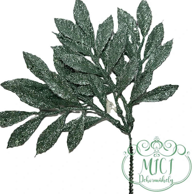 Csillámos dekor; Pick csokor; ágacskák levelekkel; csillámos flitteres; beszúróval együtt 30cm/5ágacska; ágacska hossza 15-17cm; (7db levél/ág)