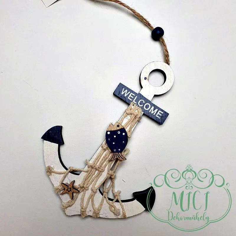 Fa akasztós nyári dekor; HORGONY hálóval-halacskával; WELCOME felirattal; fehér-kék-natúr; 10,5*14,5