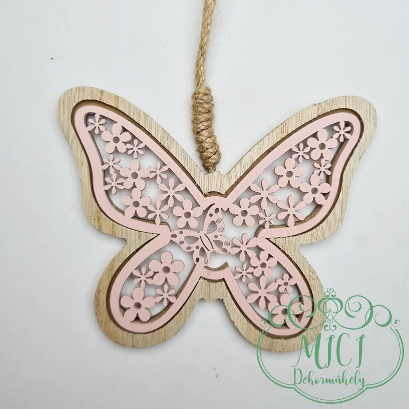 Fa dekoráció; akasztós; pillangó-lepke forma; áttört mintával; 11,5*9cm