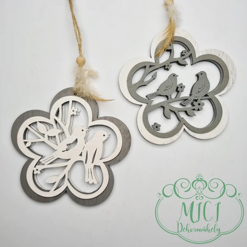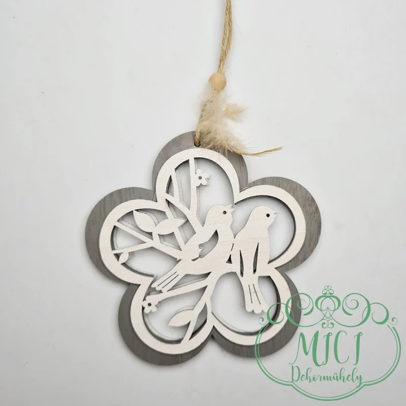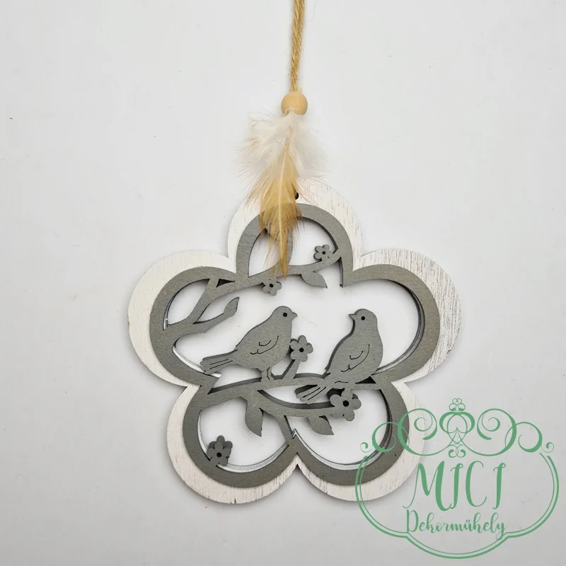 Fa dekoráció; akasztós; virág forma; áttört madárka mintával; fehér-szürke; 12*12cm