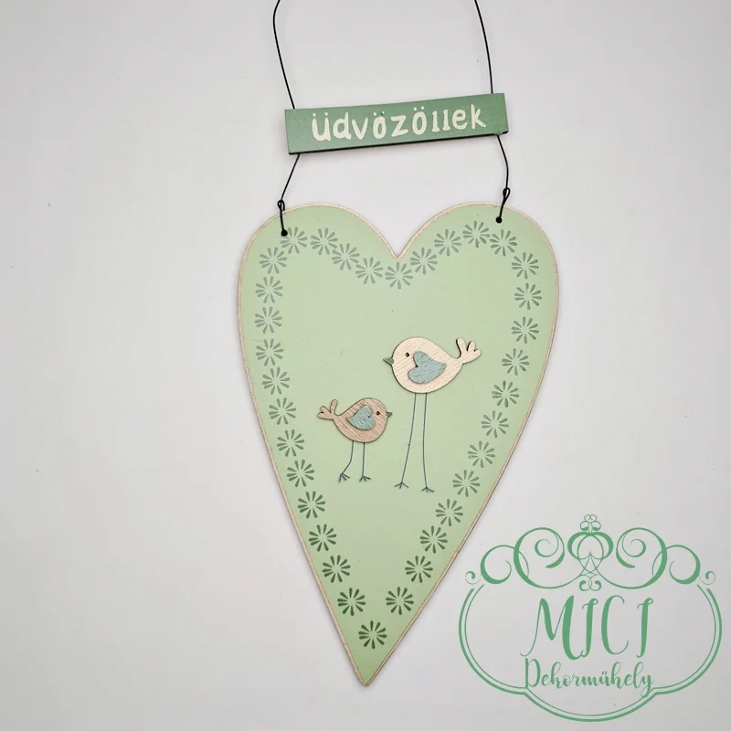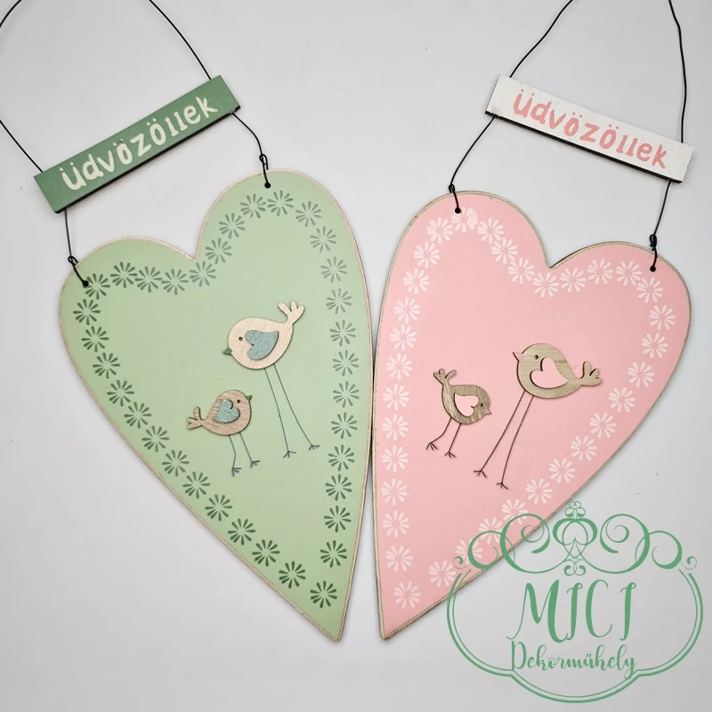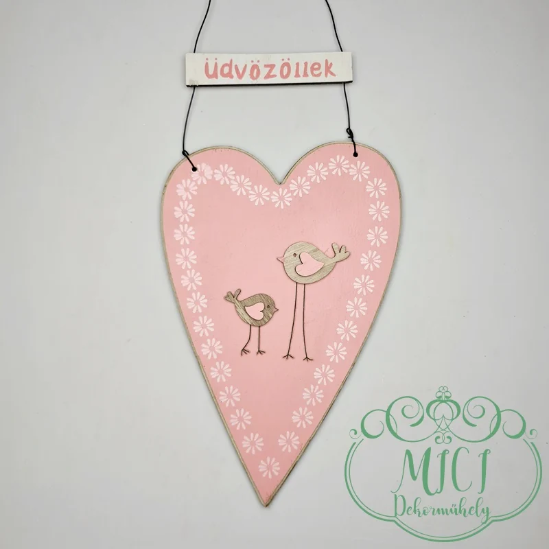 Fa dekoráció; szív madárkával; üdvözöllek felirattal; zöld/rózsaszín; akasztós; 15cm