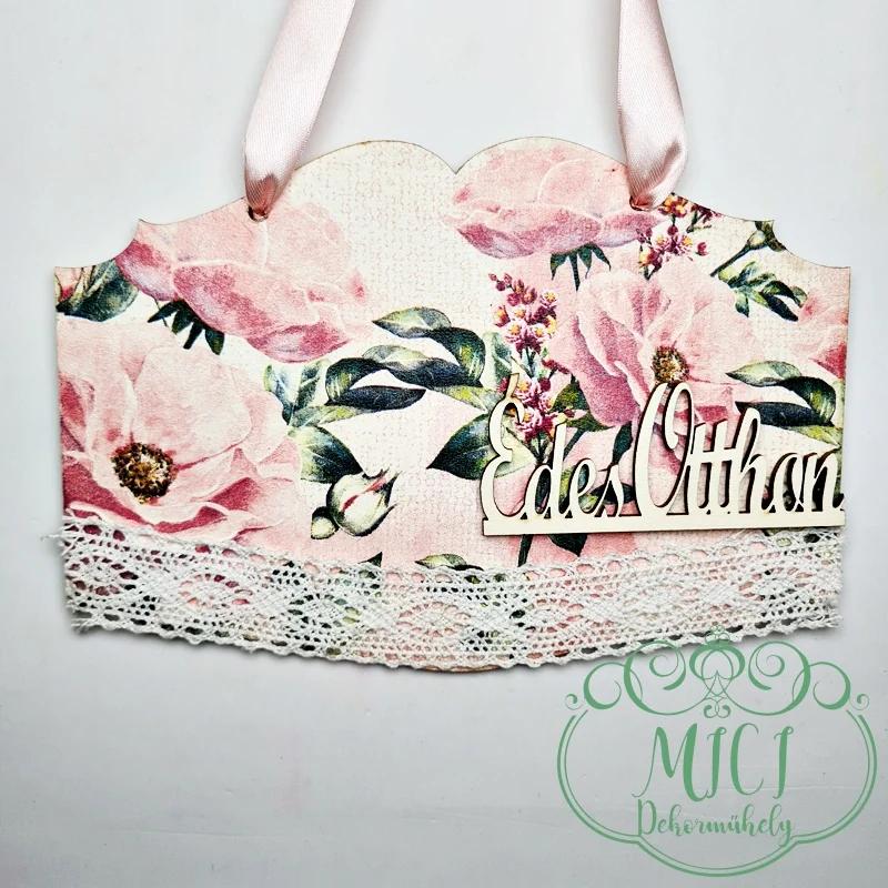 Fa tábla; ajtókopogtató; Szögletes-csipkével; Édes Otthon; Vadrózsa minta; 22*15cm