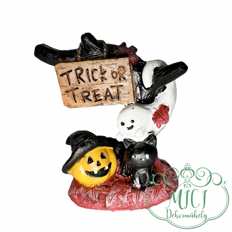 Halloween dekoráció; kalapos tök; fekete macska; szellem; fekete fa; TRICK OR TREAT felirattal; Poly