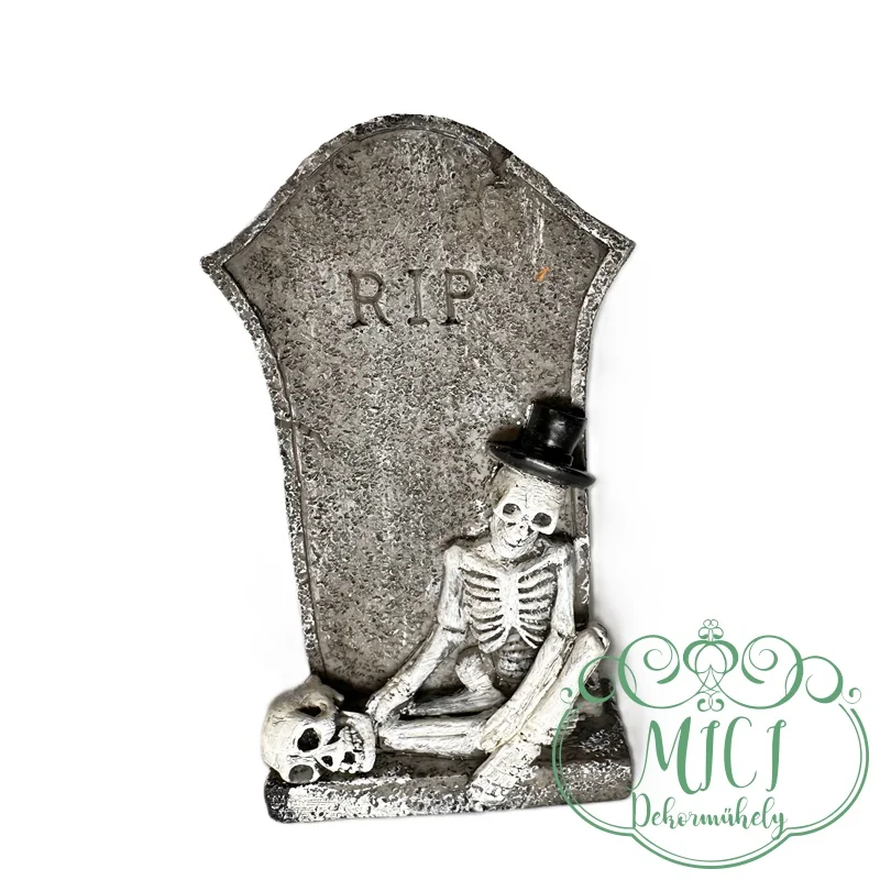 Halloween dekoráció; sírkő csontvázzal-koponyával; RIP felirat; polyresin; 7*12cm