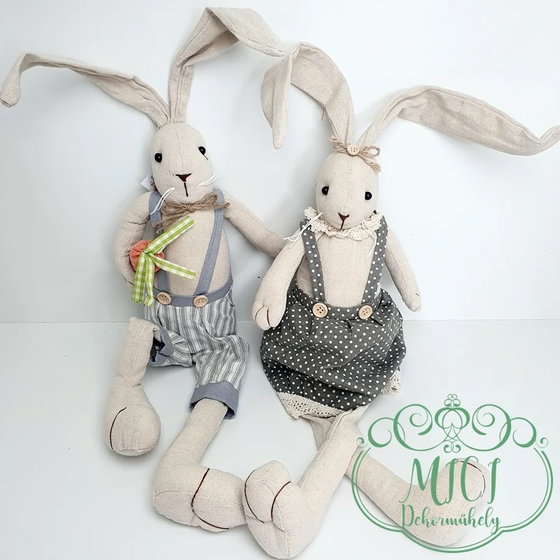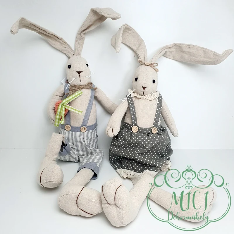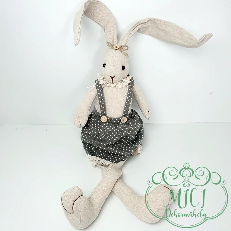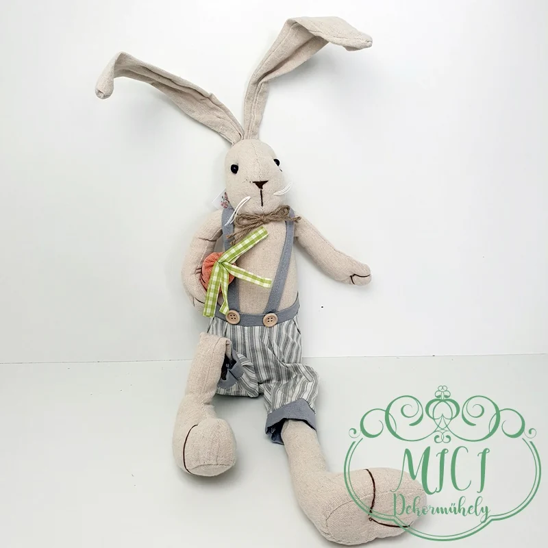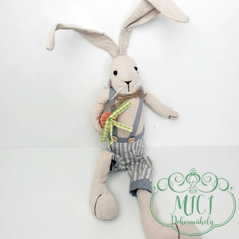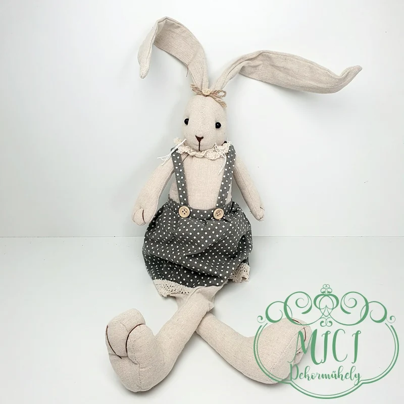 Húsvéti textil nyuszi; Nyúl fiú/lány; régies ruha; natúr-kékes/szürkés; nehezéskes-ülő; lógólábú; 70cm teljes hossz