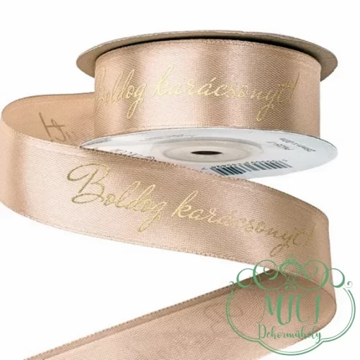 Karácsonyi dekorációs szalag; púder barna; „Boldog Karácsonyt!”; feliratos szatén szalag; 25mm vastagságú