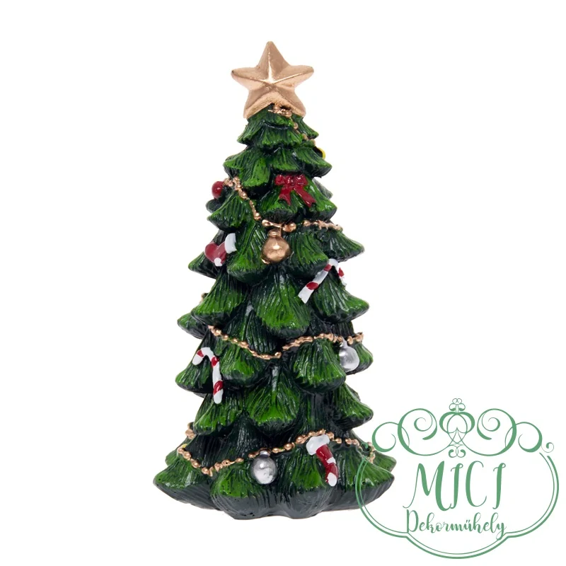 Karácsonyi falu kellék; Karácsonyfa; zöld-díszített; polyresin; 11,5×6,2×6,4cm