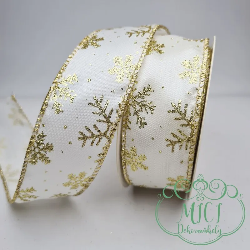 Karácsonyi szatén drótos szalag; arany hópihe minta; fehér/piros/bordó; 40mm vastagságú