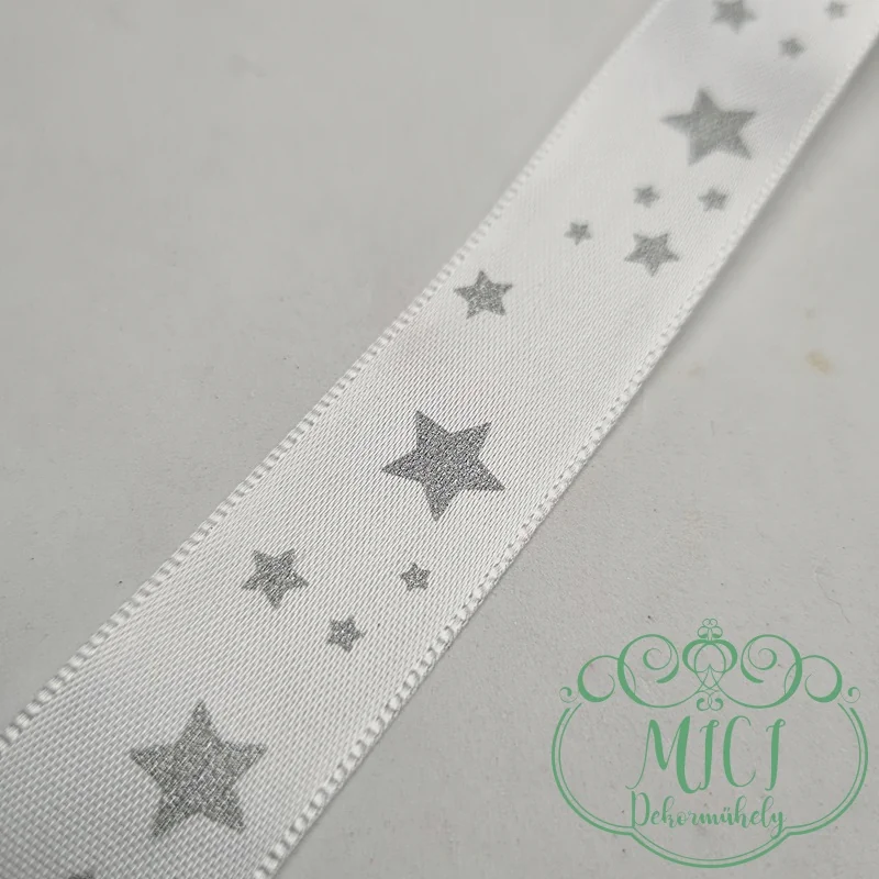 Karácsonyi szatén szalag; fehér; ezüst csillagok minta; 20mm vastagságú