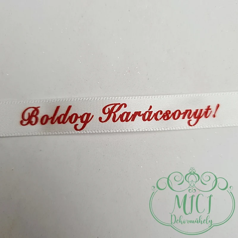 Karácsonyi szatén szalag; fehér-piros; BOLDOG KARÁCSONYT felirat; 13mm vastagságú