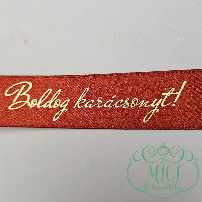 Karácsonyi szatén szalag; piros-arany; BOLDOG KARÁCSONYT felirat; 25mm vastagságú