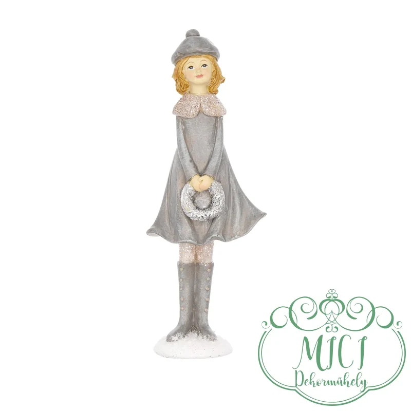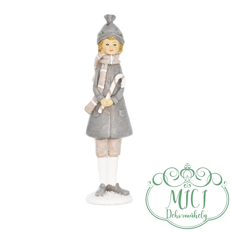 Kerámia baba; fiú/lány; álló téli gyerekek; nyalókával/koszorúval; szürke-drapp-fehér; polyresin; 5