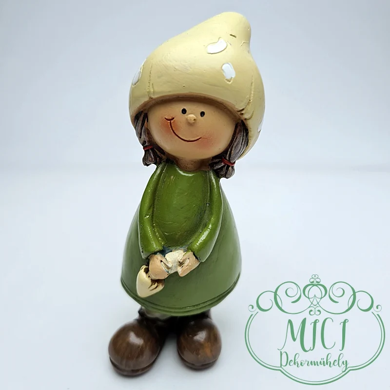 Kerámia baba; fiú/lány; gomba sapi; zöldes-sárga/krém; álló; polyresin; 4*10,5cm