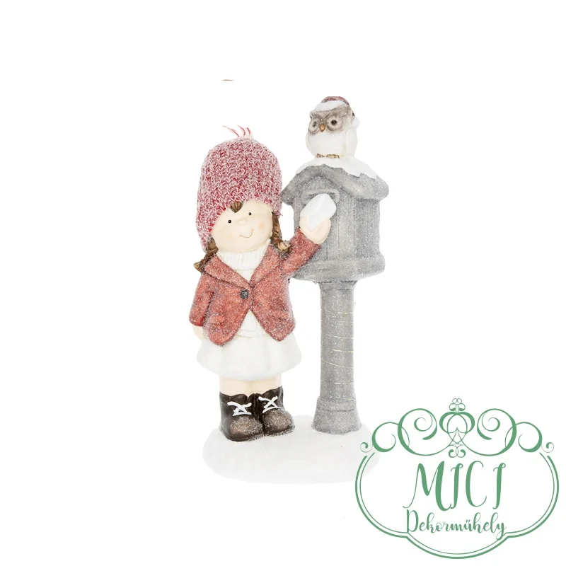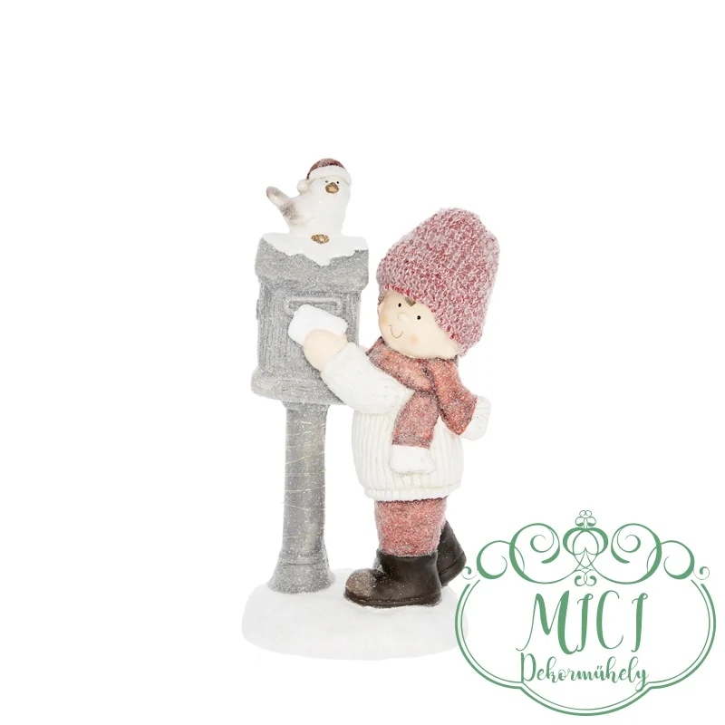 Kerámia baba; fiú/lány; LED-es postaláda madárkával; piros-fehér-szürke; polyresin; 23,5×16,5x56cm
