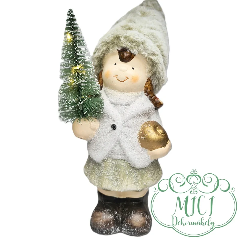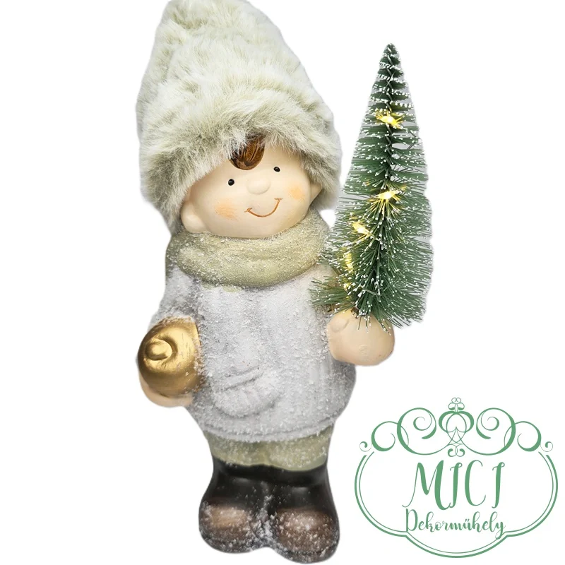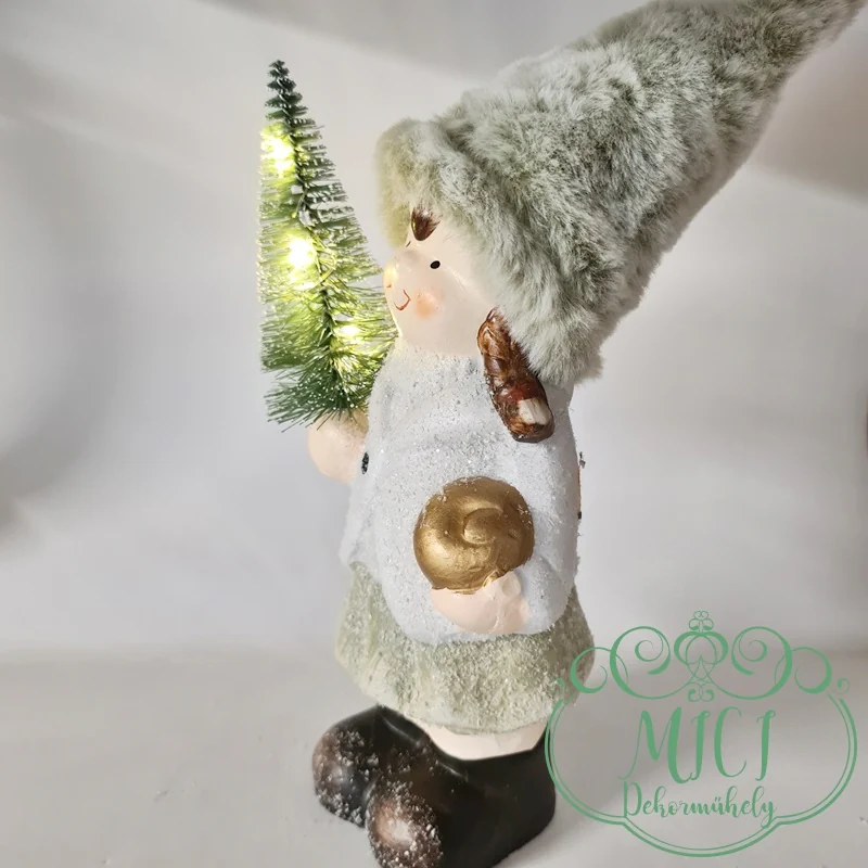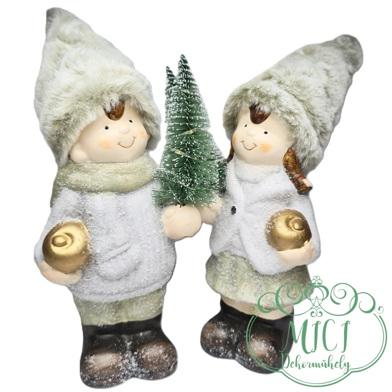 Kerámia baba; fiú/lány; textil bunda sapiban; LED-fenyőfa; zöld-fehér-szürke; álló; 26*10cm