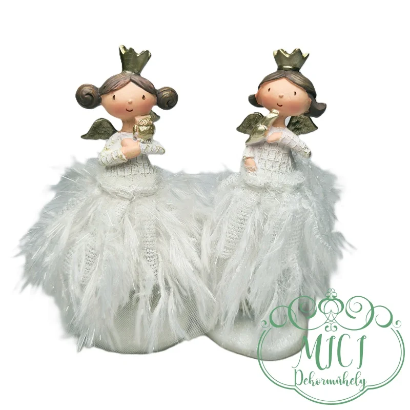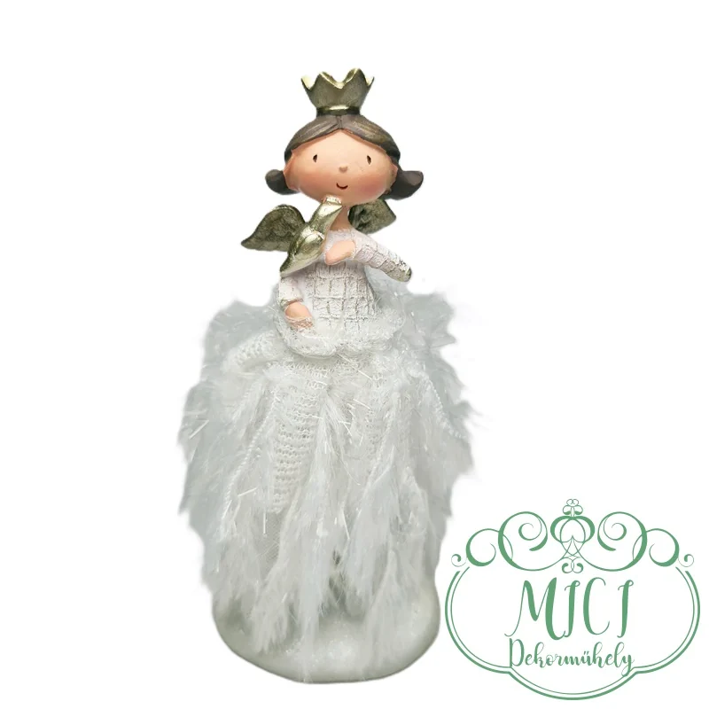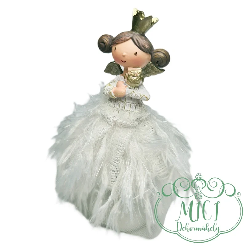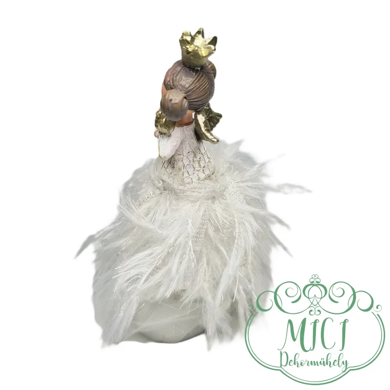 Kerámia baba; királylány; angyal szárnyakkal; rojtruha; fehér; álló; galamb/bagoly; polyresin; 11*3cm