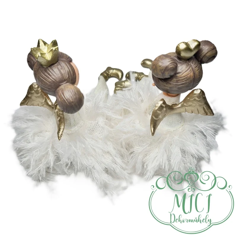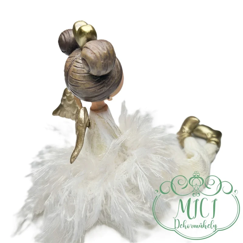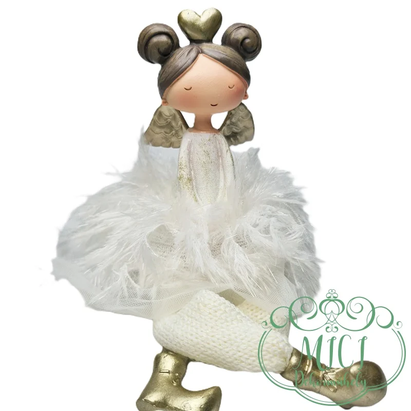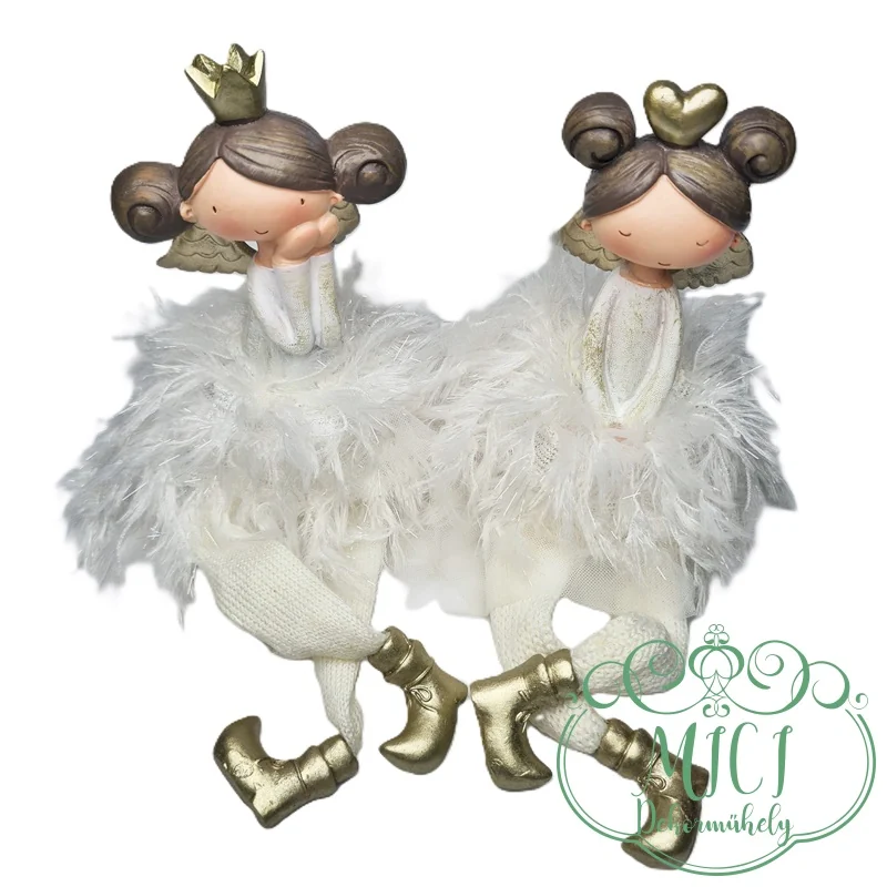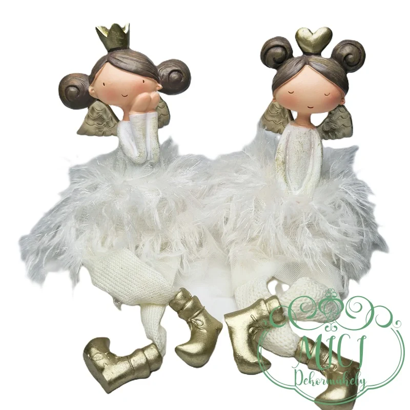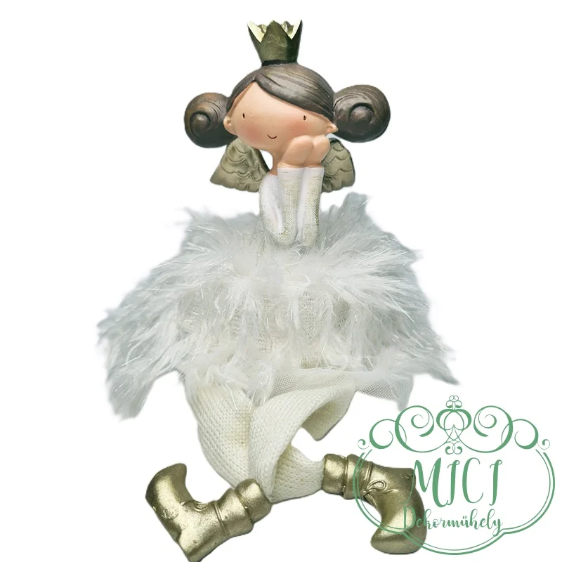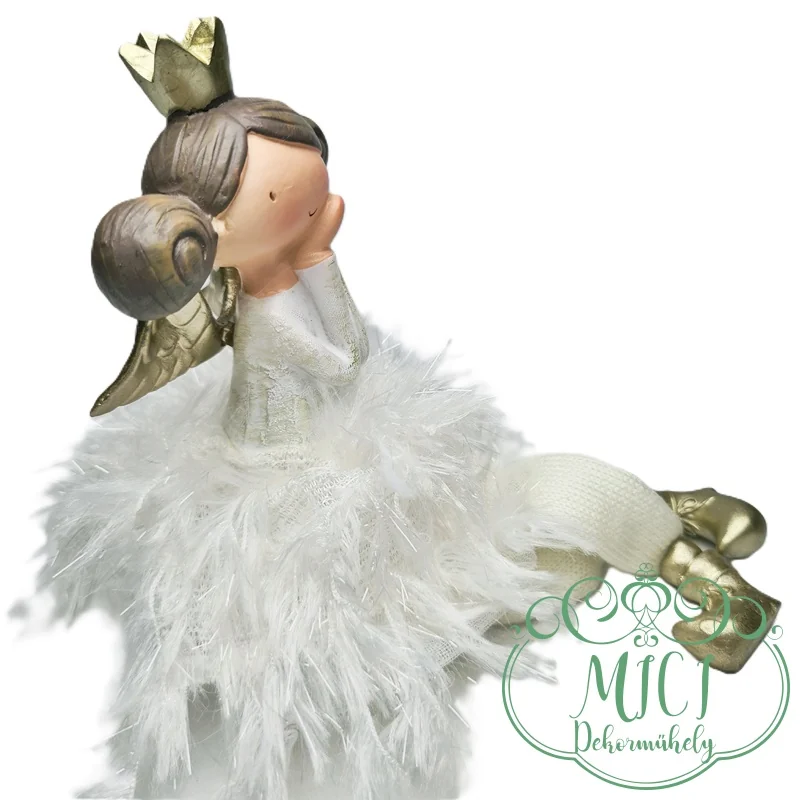 Kerámia baba; királylány; angyal szárnyakkal; rojtruhában; fehér; ülő-lógólábú; korona/szív; polyresin; 12*5cm+láb
