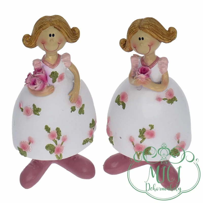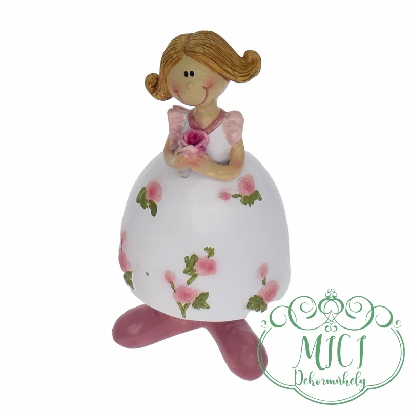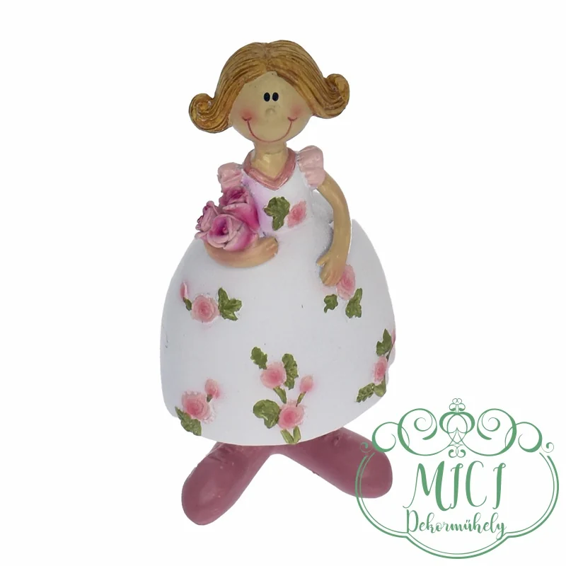 Kerámia baba; Lány virágos ruhában; rózsával a kezében; fehér-rózsaszín; álló; polyresin; 5,5×4,5×10,5cm