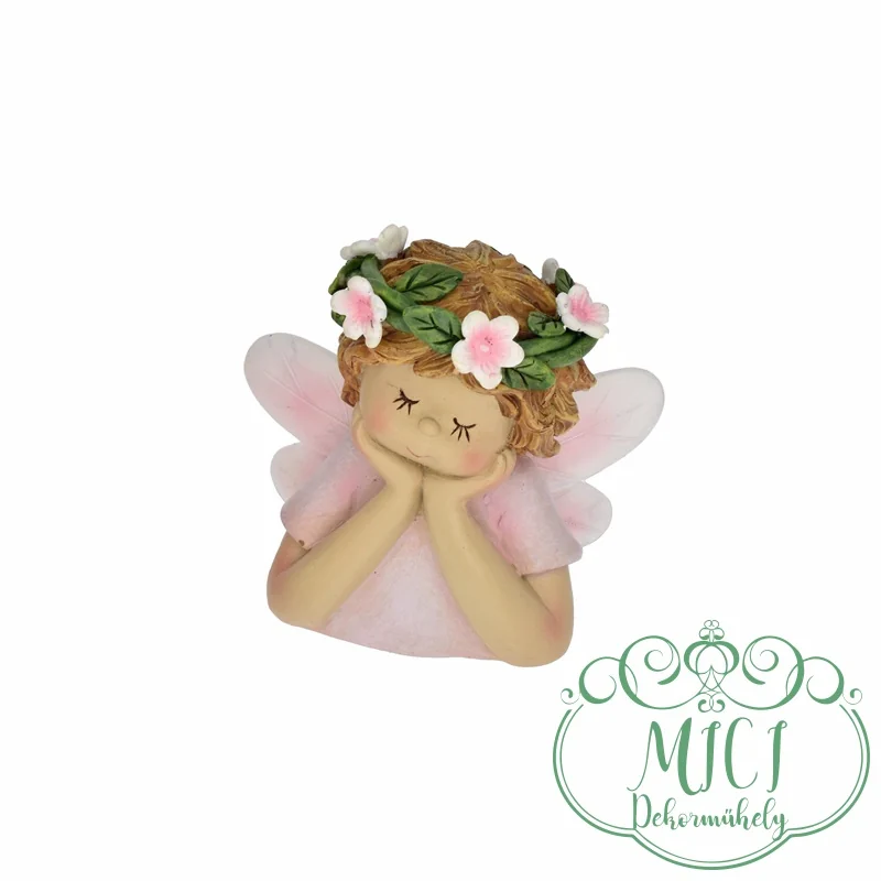 Kerámia baba; Tündér lány; virágkoszorúval fején; rózsaszín; polyresin; 10×6,5x9cm