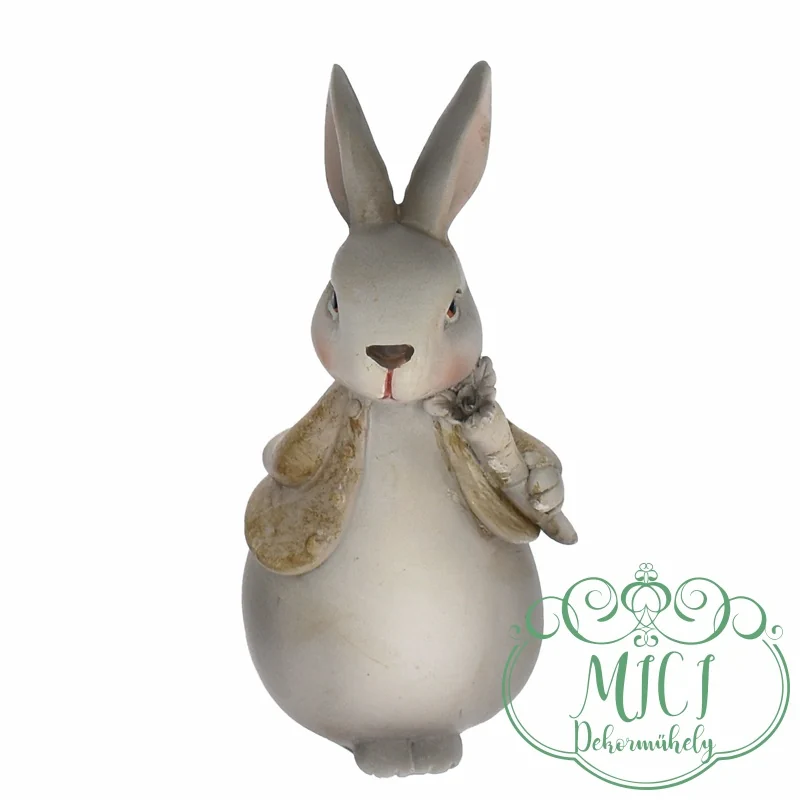 Kerámia húsvéti nyúl; répával a kezében; szürke-bézs; álló; polyresin, 4x4x9cm