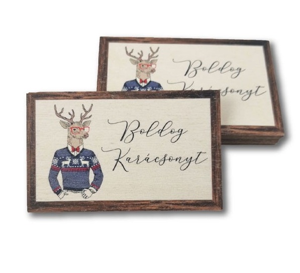 Egyedi fa tábla, Kiegészítője lehet adventi boxnak, koszorúnak, ajtókopgatónak, ajándéknak , karácsonyi dekorációnak. Téglalap formájú, képkeret jellegú, elegáns szarvas mintával, boldog karácsonyt felirattal