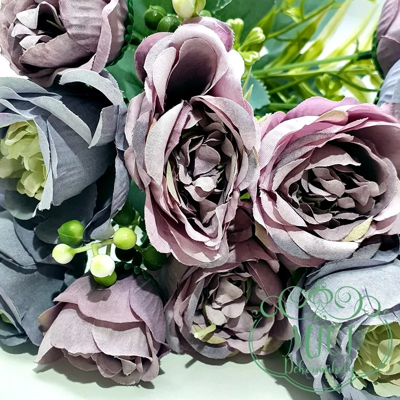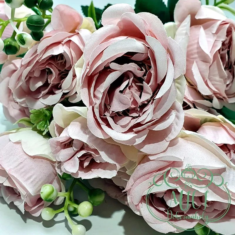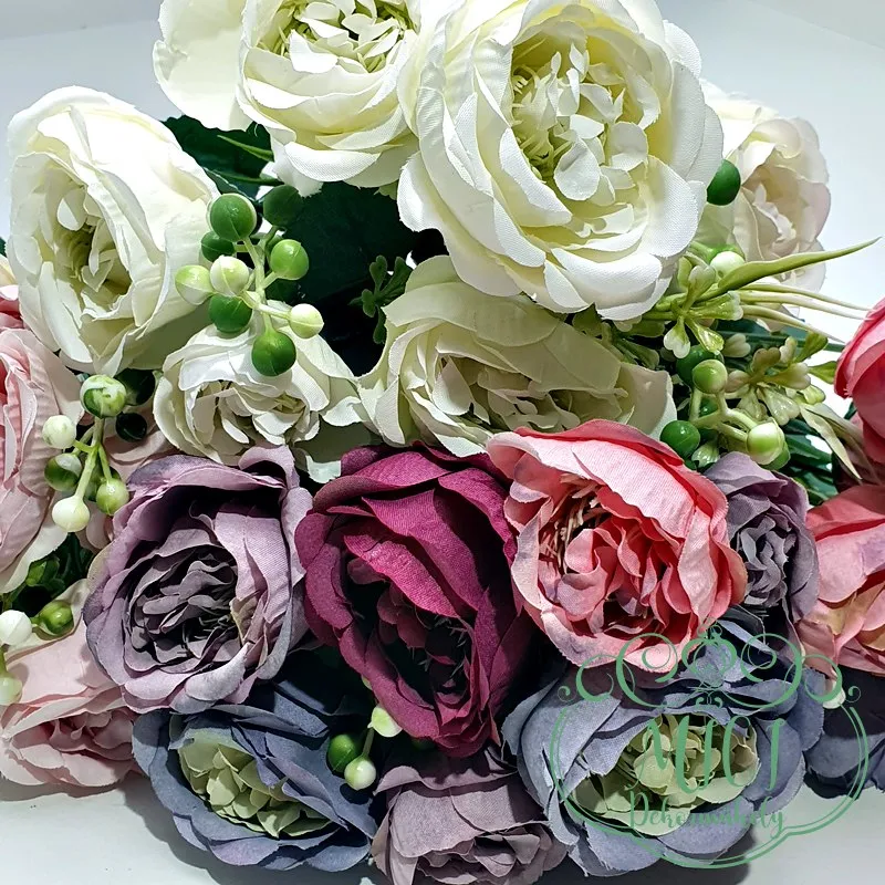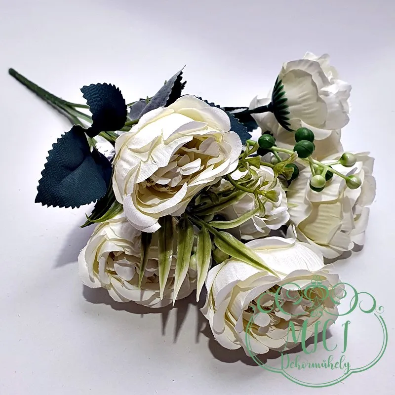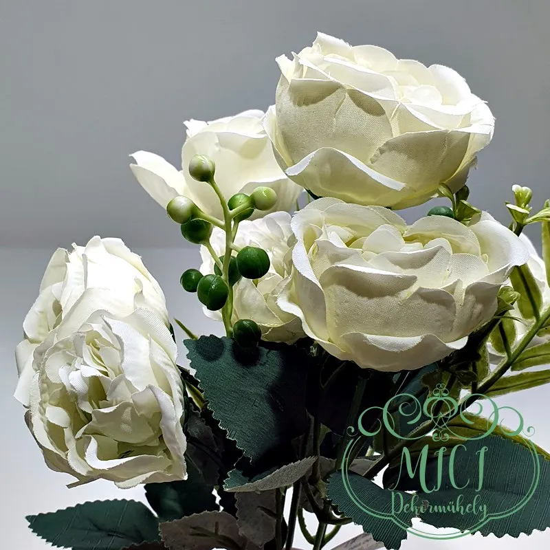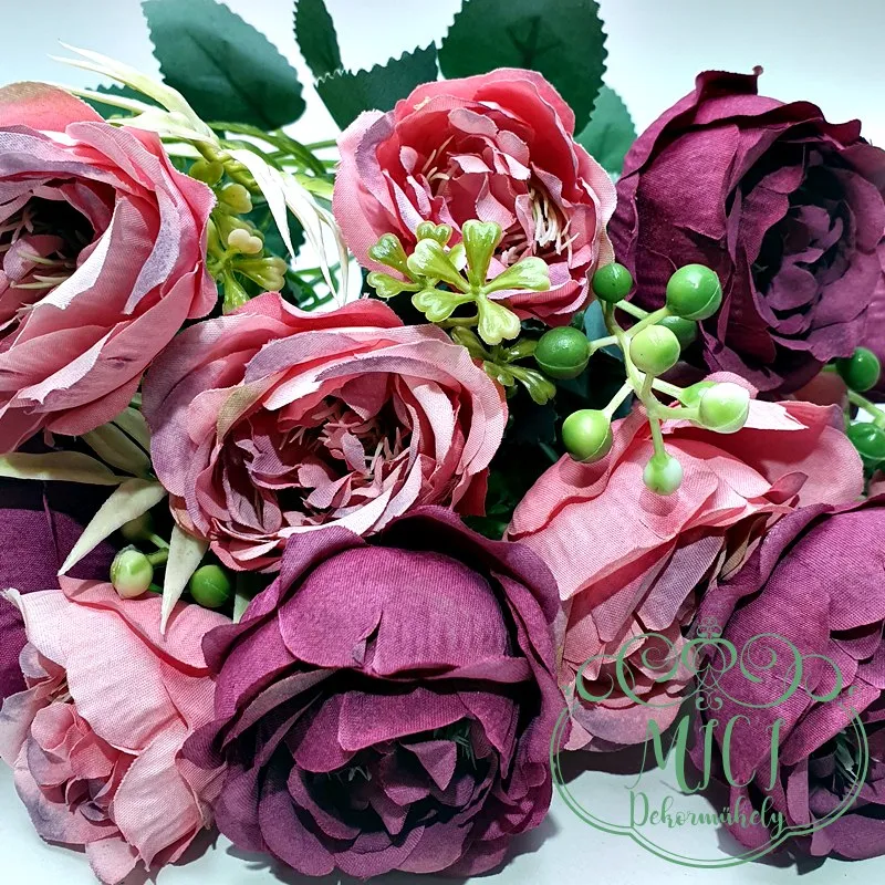 Művirág csokor;selyemvirág; RÓZSA csokor;bazsarózsa;fehér/halvány rózsaszín/magenta/lila; 5ágú;~30cm