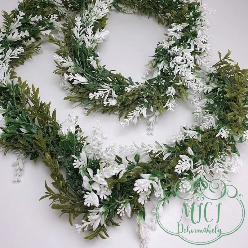 Pozsgás növény; GIRLAND; zöld levél-fehér virág szerű ágacskák; 183cm/~7cm