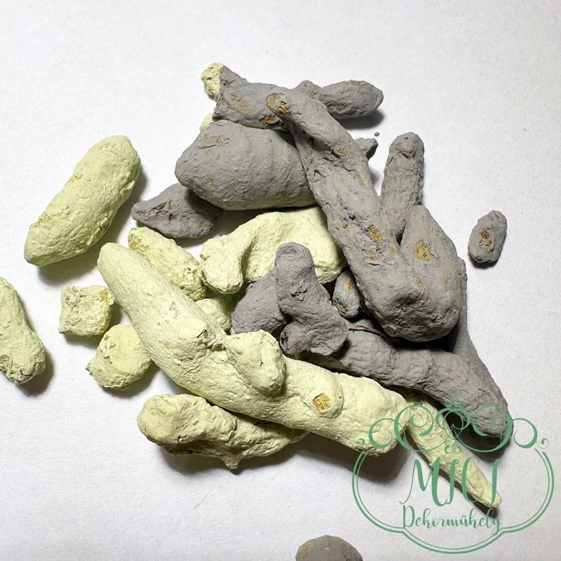 Szárított növény rész, Kurkuma; kinézetét tekintve korall darabkára hasonlít, természetes dekorációs alapanyag. A termés segítségével számos koszorút, asztaldíszt vagy egyéb dekorációs készítményt feldobhatunk. Kiegészítője lehet adventi boxnak, koszorúnak, ajtókopgatónak, karácsonyi dekorációnak, szinte minden szezon dekorációjának, legyen az téli, tavaszi, őszi, nyári. A termés kis kiszerelésben vásárolható meg. 6*8cm zacskóba; mérettől függően 6-10db/csomag; átmérője:0,3cm-3cm között változik; hosszúsága: 1cm-5cm között