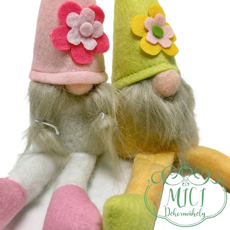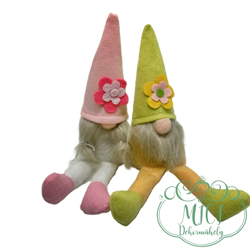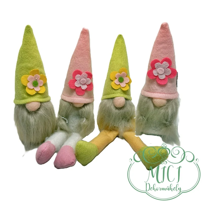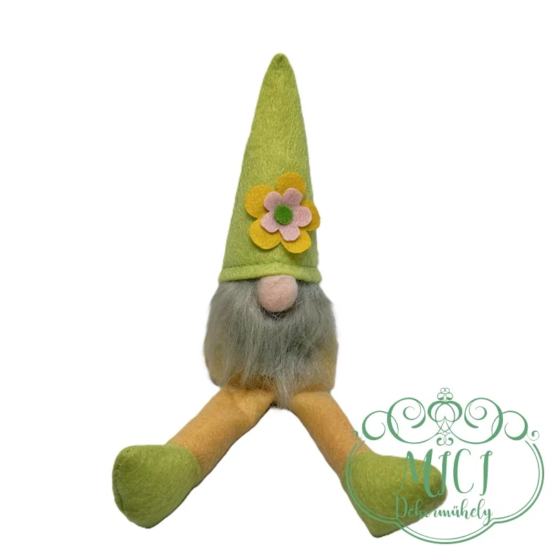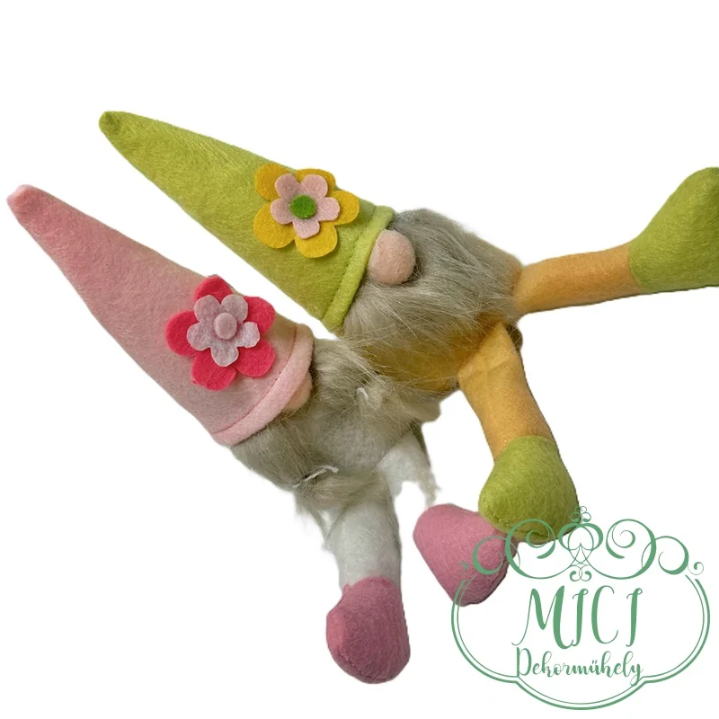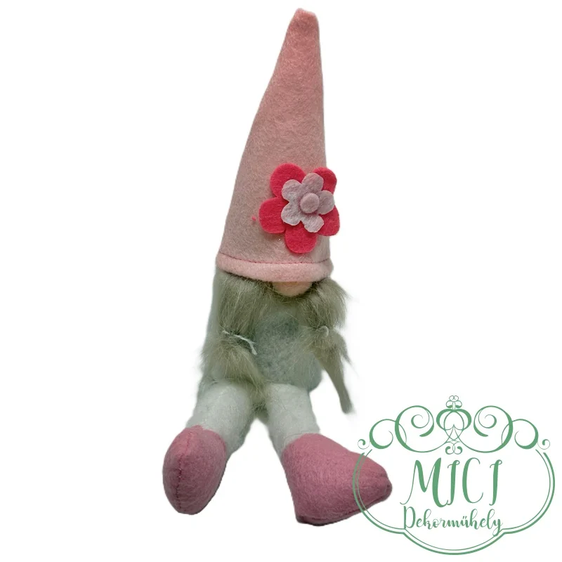 Tavaszi textil manó; tavaszi manó; zöld/rózsaszín; fiú/lány; nehezéskes-ülő; lógólábú; 17cm+lógóláb