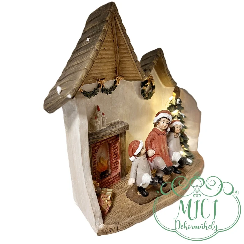 Téli jelenet; táncoló gyerekek; kandalló-fenyőfa; LED-es; régies; polyresin; 24*10*22cm