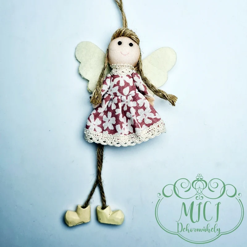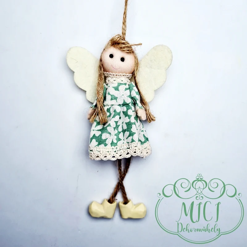 Textil angyal lány; zöld/rózsaszín virágos ruha; akasztós; lógólábú; 14*9cm+akasztó