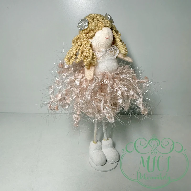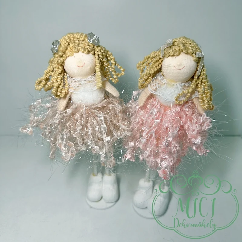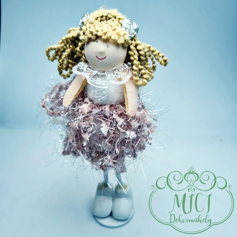 Textil baba; fényes csillogós ruha; álló; rózsaszínes; 18cm