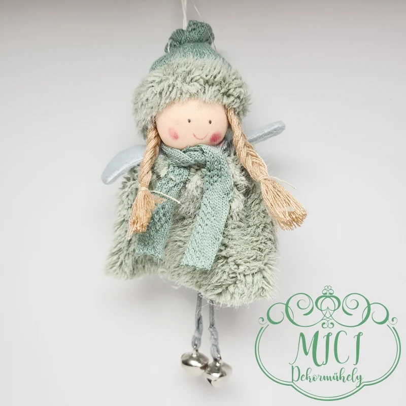 Textil baba; Fiú/Lány gyerek sapkában; csengővel; akasztós; zöld; 16*10cm