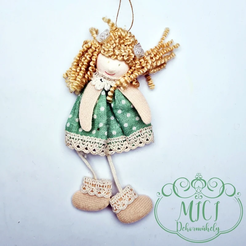 Textil lány; textil baba; zöld/rózsaszín ruha pöttyös ruha; akasztós; lógólábú; 14,5*6cm+akasztó