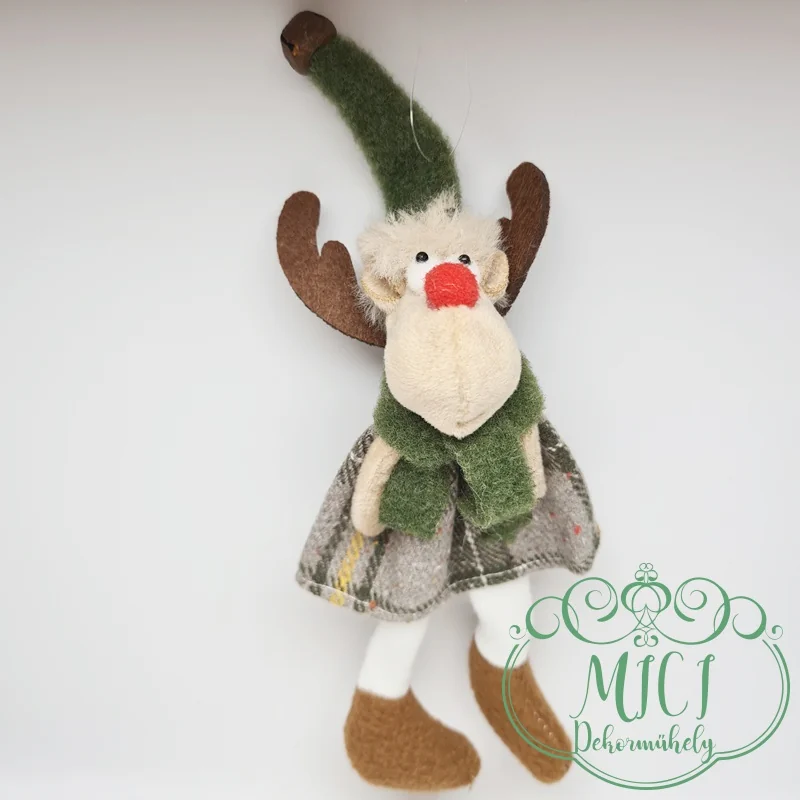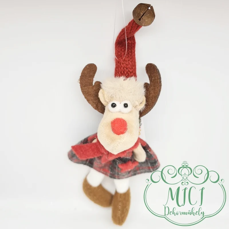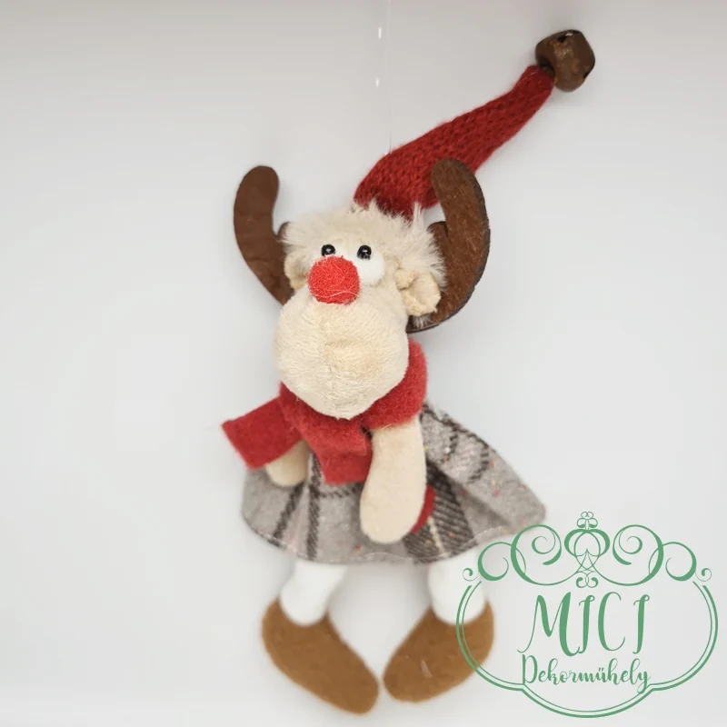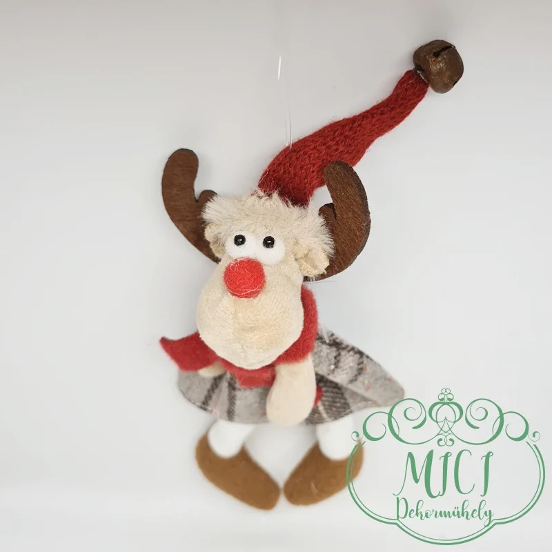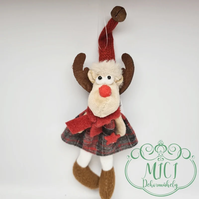Textil rénszarvas; akasztós; kockás ruha; lógólábú; 24*10cm