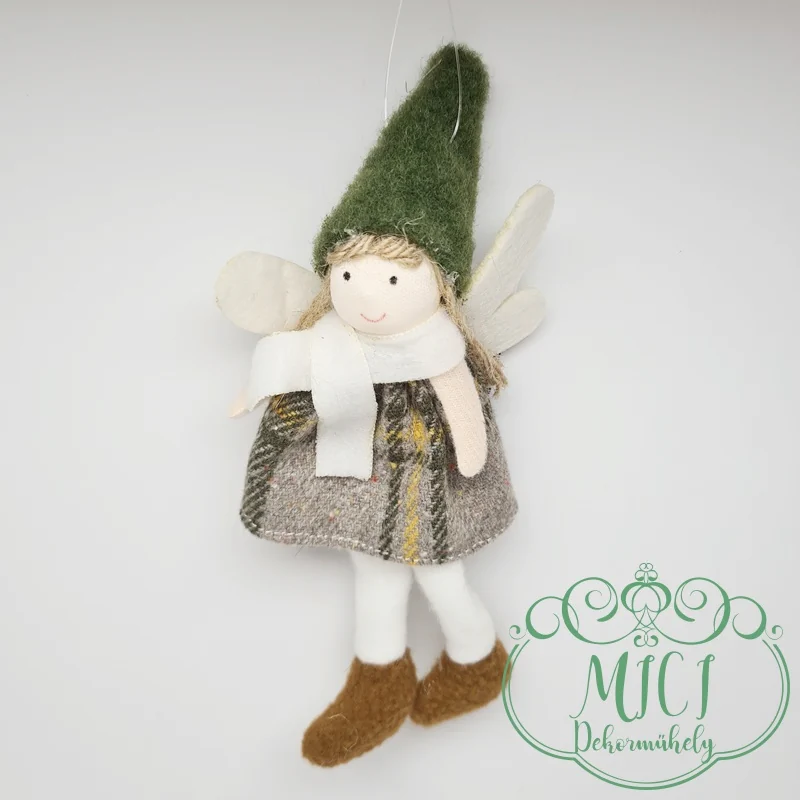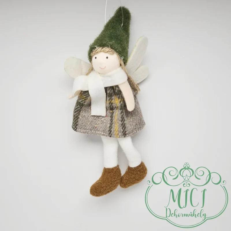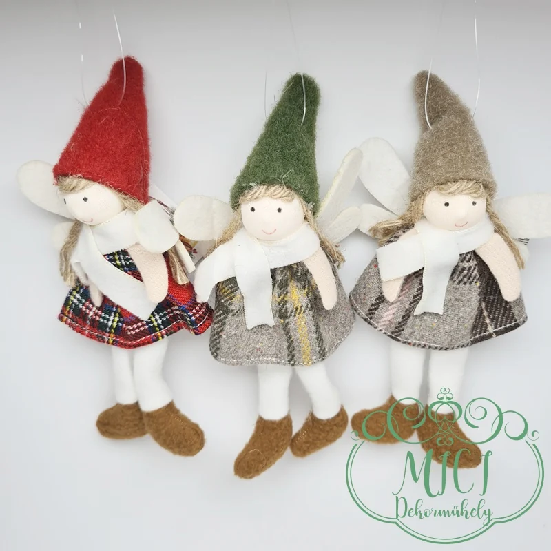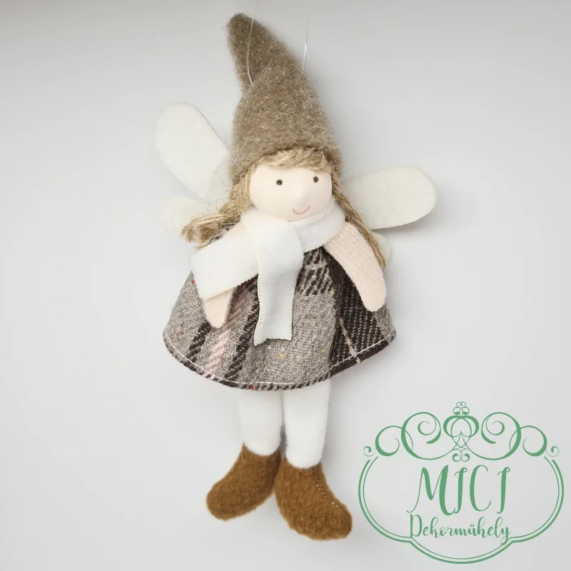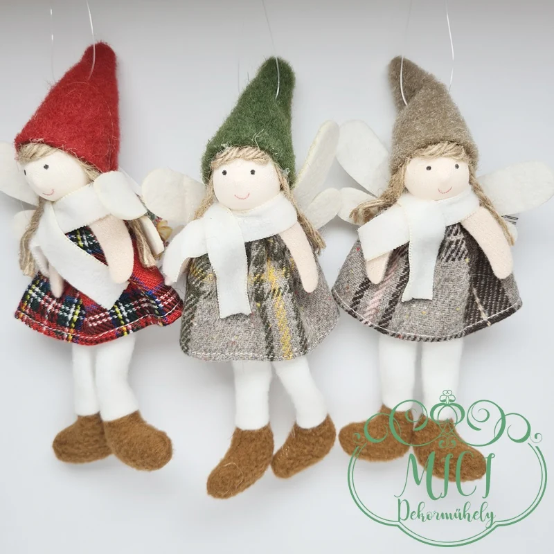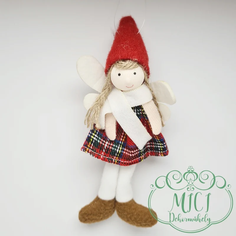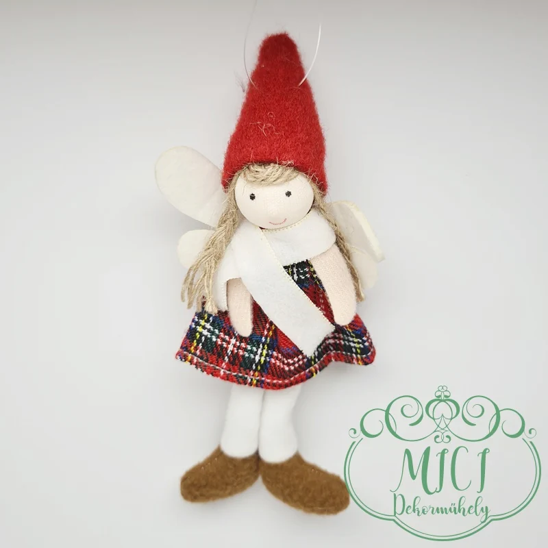 Textil téli-baba; akasztós; kockás ruha-kalappal; angyal szárnyak; lógólábú; 17*7,5cm