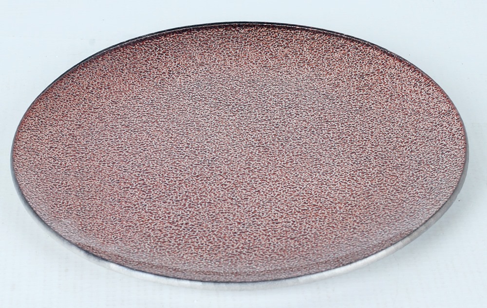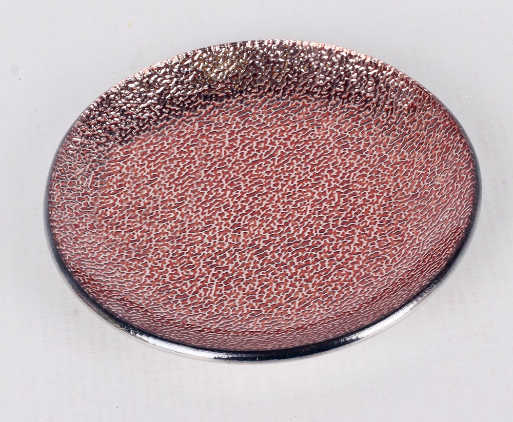 Kör alakú, rose színû üvegtál, 11,5cm átmérõjû. Gyertya alátétnek alkalmazható, vagy egyéb dekorációs célra. Az üvegtál aló felülete rücskös, felsõ felülete sima. Ráhelyzett gyertya köré különbözõ dekorációs elemek rakhatóak.